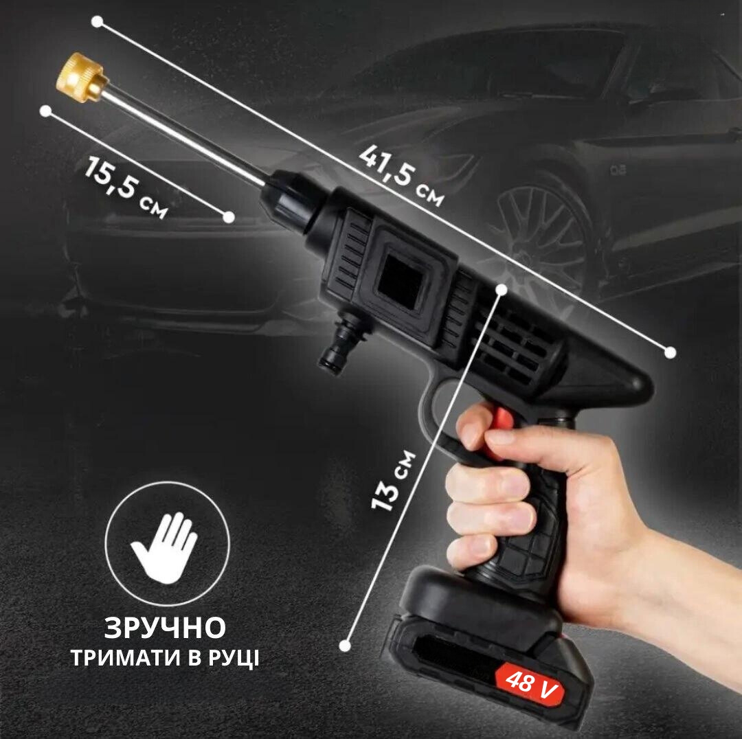 Вона легко поміщається у багажнику вашої автівки, швидко заряджається та безперебійно працює до 60 хвилин на максимальній потужності. З нею, Ви зможете помити свою машину на дачі, у дворі, на природі.