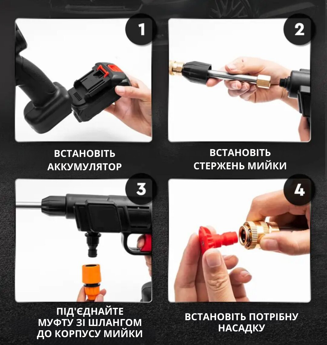Автомийка оснащена літієвою акумуляторною батареєю ємністю 24 000 mah з тривалим терміном служби.